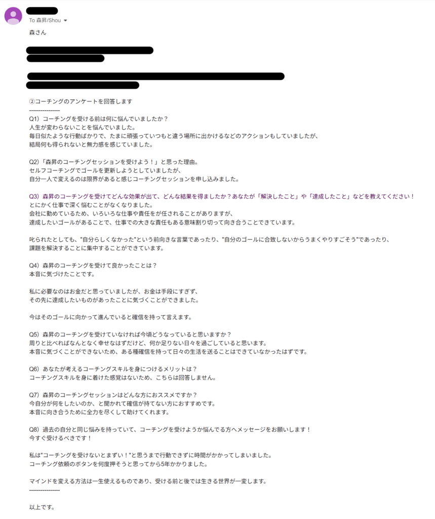 Q3)森昇のコーチングを受けてどんな効果が出て、どんな結果を得ましたか?あなたが「解決したこと」や「達成したこと」などを教えてください!